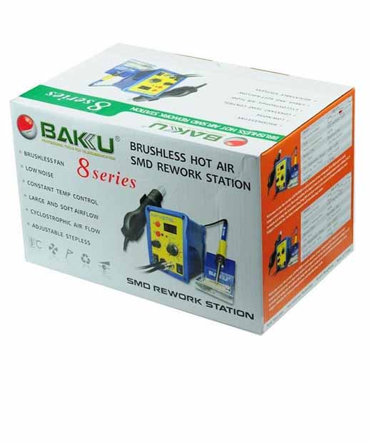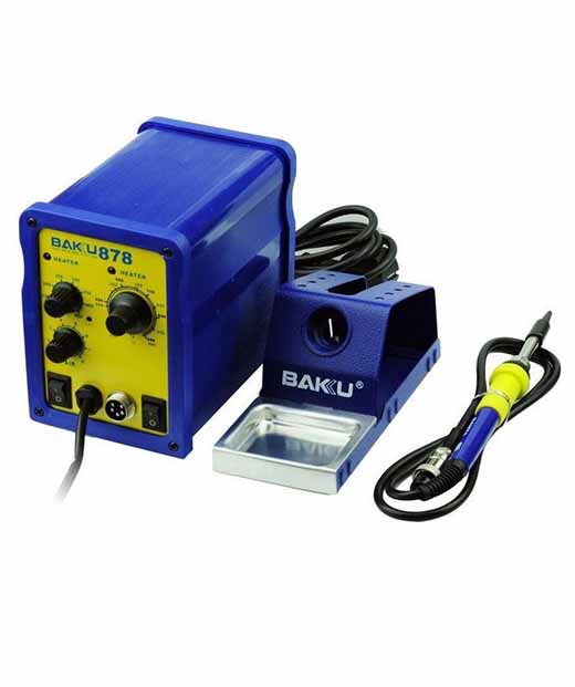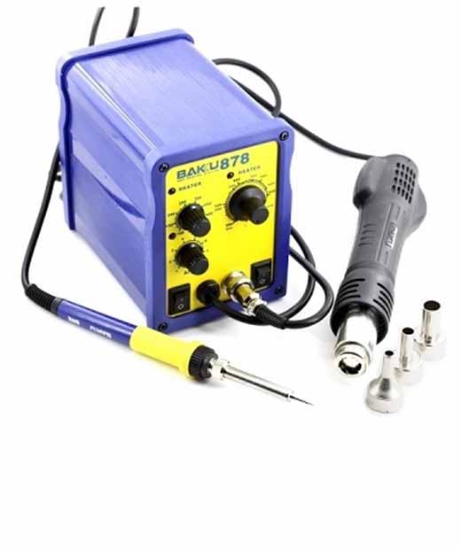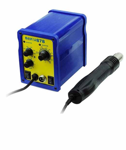 Station de reprise SMD à air chaud – BAKUBK-878. Conçu pour le soudage avec des composants CMS tels que SOIC, QFP, PLCC et BGA. Un excellent choix pour réparer les petits appareils électroniques tels que les téléphones portables et les caméras vidéo, ainsi que les appareils électroménagers.