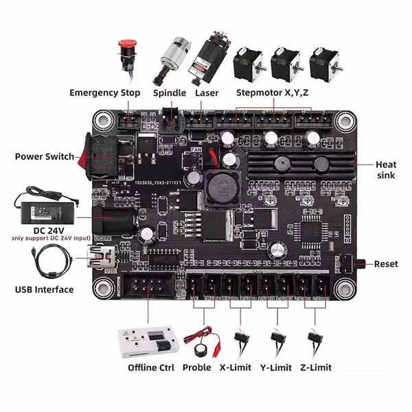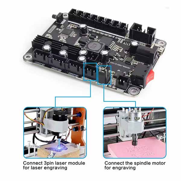 GRBL CNC Carte de commande monobloc, entraînement à trois axes + entraînement de la broche, peut piloter directement le système à trois axes + contrôle de la puissance de la broche, éliminant ainsi le besoin de connexion électrique, convient aux machines à graver ordinaires et aux machines à graver laser. Puce d’entraînement de broche: MOSFET, le plus haut 60V (recommandation dans les 48V, courant: dans 10A) Moteur pas à pas 12V, courant maximum de 2A ou moins est recommandé dans 1.5A